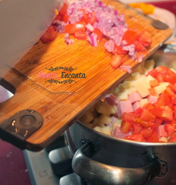 1. Coloque o macarrão para cozinha e enquanto o macarrão cozinha, comece a picar em cubos os tomates, mussarela, presunto e a cebola.